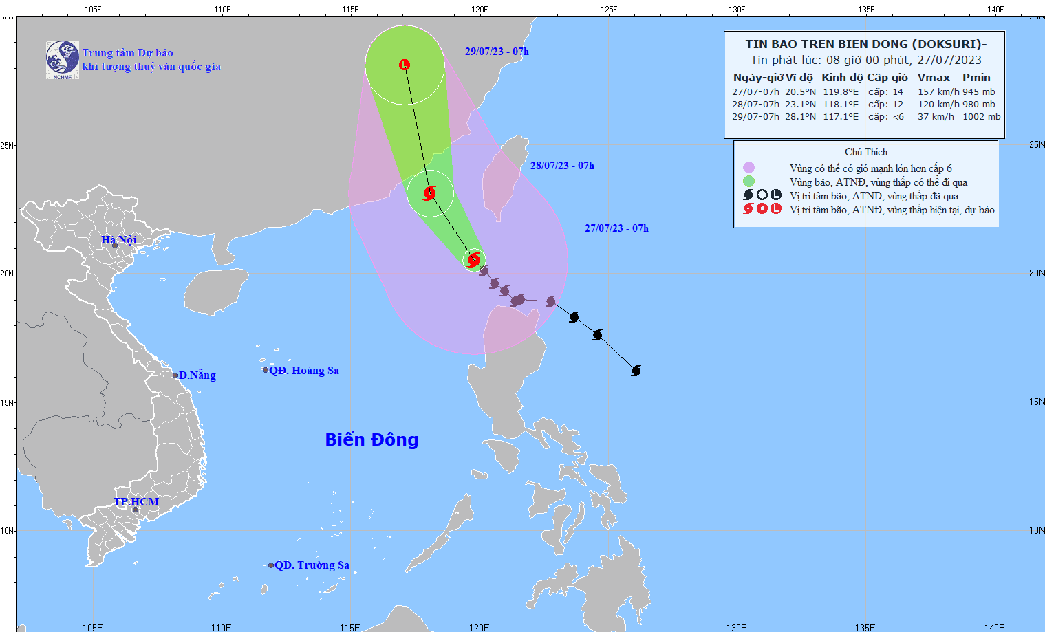 cấp 7, giật cấp 9, sóng biển cao từ 2,0-4,0m, biển động mạnh. Cảnh báo